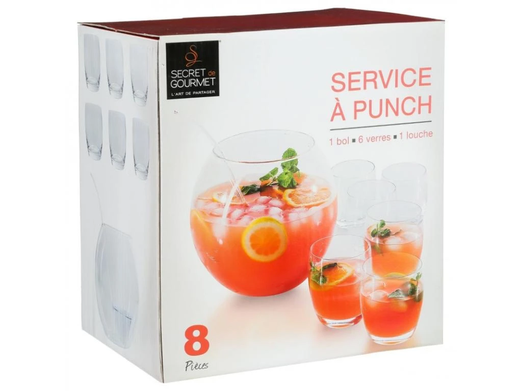 - Contient 1 cuillère, 1 saladier à punch, 6 verres