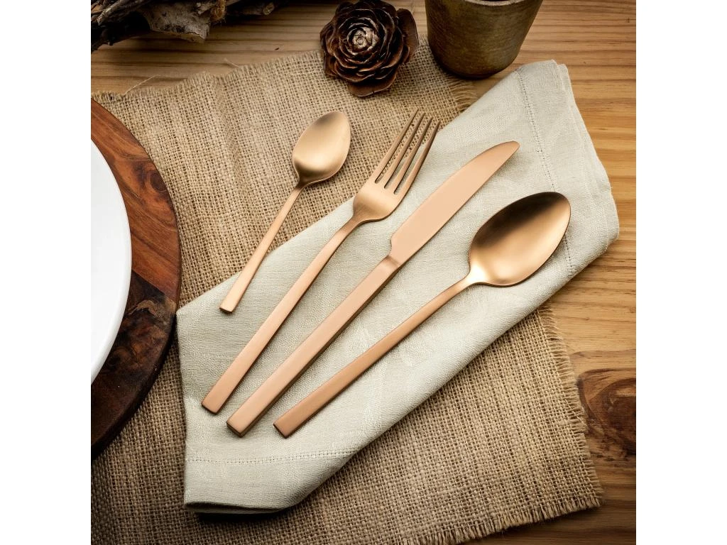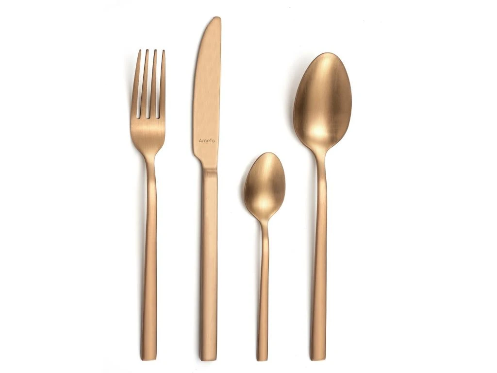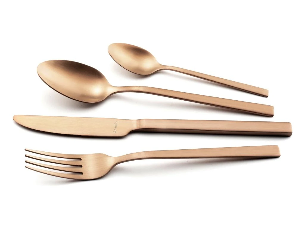 Ensemble de 16 couverts de la gamme Square. Acier Inox et finition teintée Cuivre.