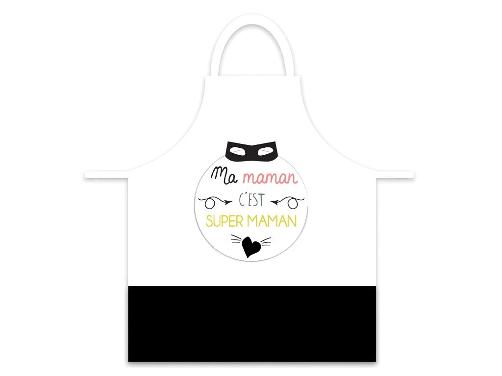 Tablier adulte à nouer – Ma Maman c’est Super Maman Taille adulte 100% coton Hauteur 78 cm – Largeur 68 cm Créé et imprimé en France