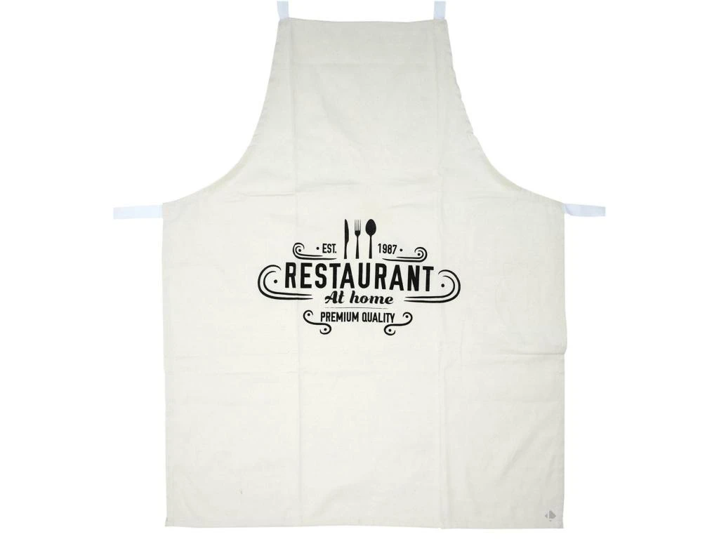 Ce tablier de cuisine avec son message « RESTAURANT AT HOME » dans des tons beige champagne sera idéal pour préparer de bons petits plats. Confection polycoton, avec lanière d’accroche.