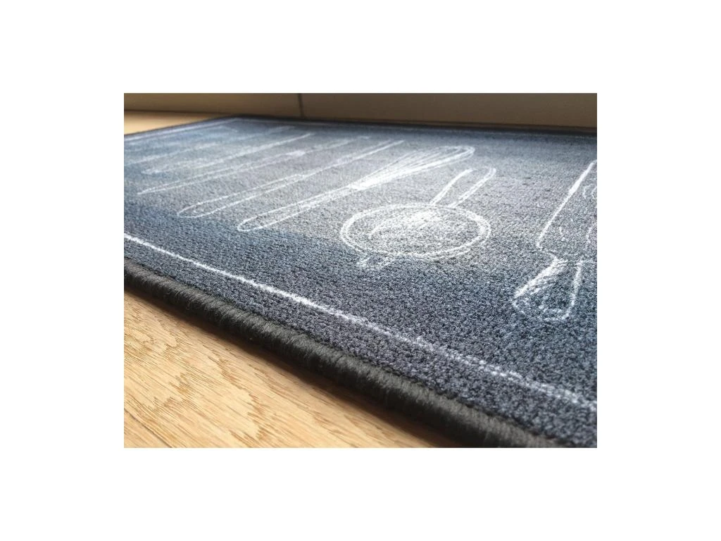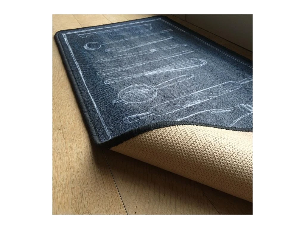 Ce tapis de cuisine noir motif couverts apportera de la déco à votre cuisine tout en protégeant votre sol des éclaboussures.