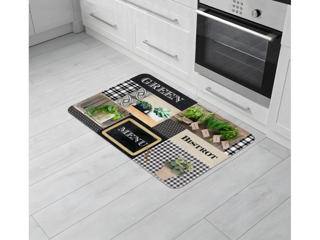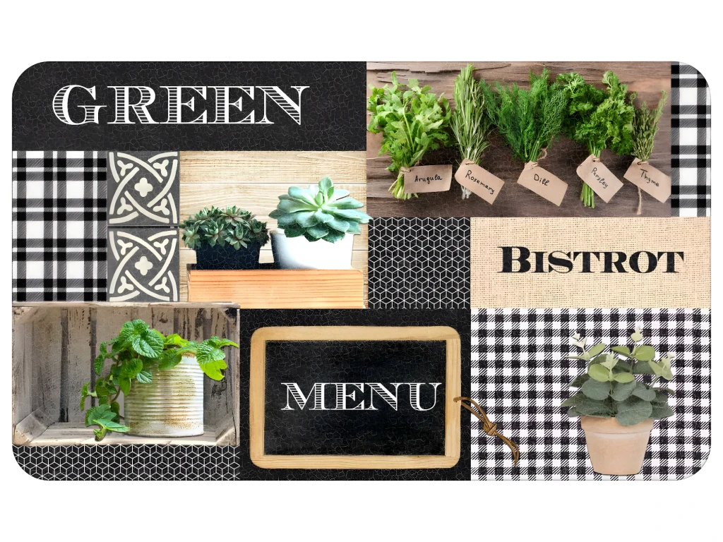 Tapis Modele Green Bistrot Menu Son style végétale va embellire votre sol et en plus va le proteger! Matière: Mousse PVC Anti-dérapant Dimensions : largeur 45 x longueur 75 cm Entretien: d’un coup d’aspirateur! Lavage à la main Toute une gamme de produits dans cette nouvelle Collection