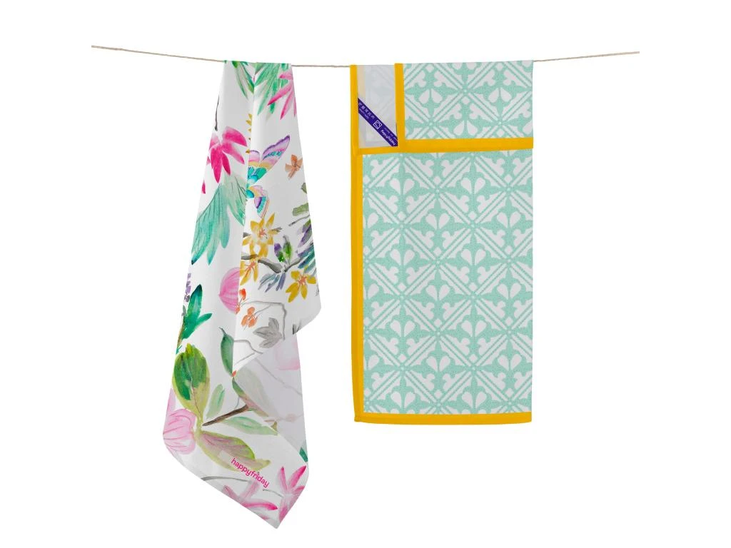 Lot de 2 torchons entièrement fabriqués en Espagne en tissu « panama » 100% coton. Chaque pièce a un design différent et une patte de suspension cousue pour l’accrocher facilement. Impression digitale haute définition, solidité des couleurs et résistance au lavage.