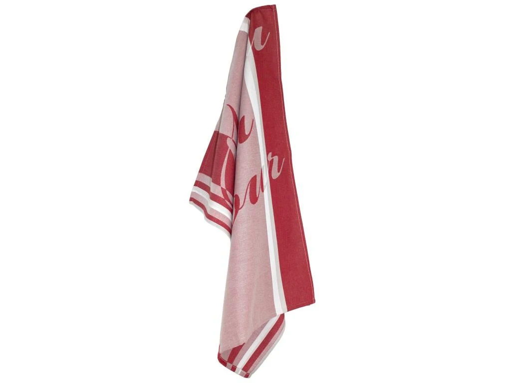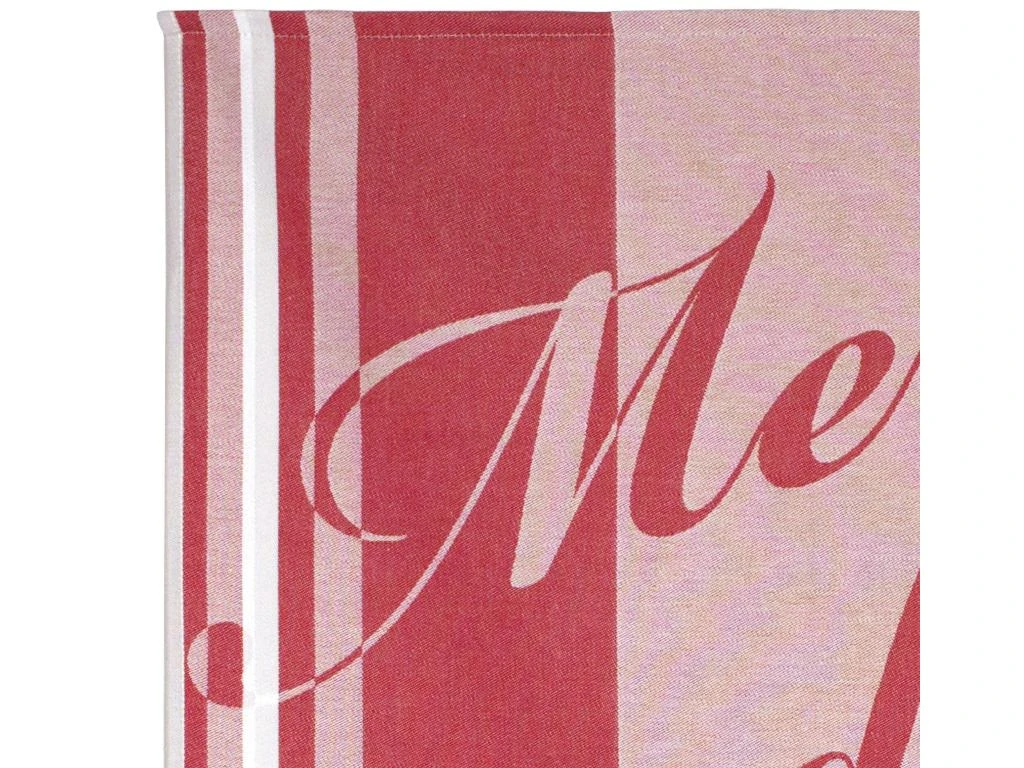 Apportez une touche d’originalité avec ce torchon de cuisine rouge, beige et blanc, tissé de l’inscription « Menu Du Jour ».