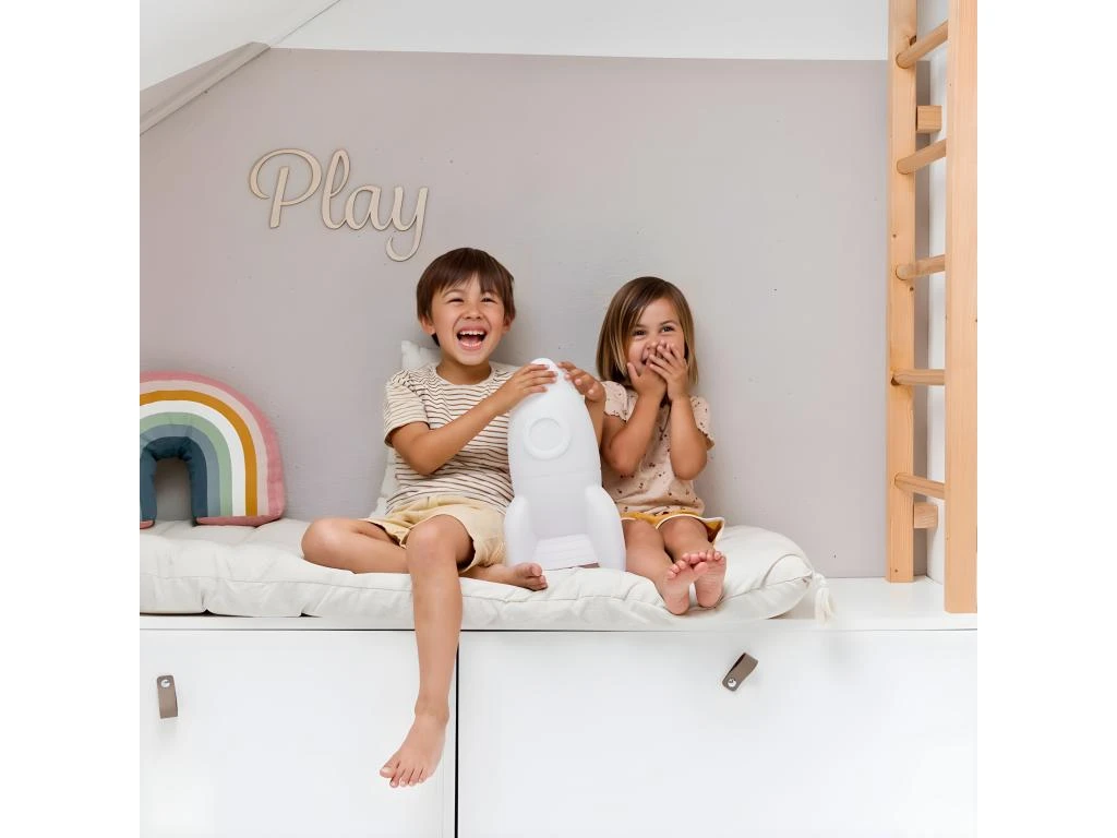 Une jolie lampe veilleuse pour la chambre de votre enfant. La fusĂ©e Apollo vus enverra dans vos rĂŞves les plus fous ! Un minuteur de 15 minutes permet de s’endormir tranquillement. Dimensions : 33.5 x 29 x 20cm Matière : pvc Câble de recharge inclus Autonomie de 10 Ă 20h
