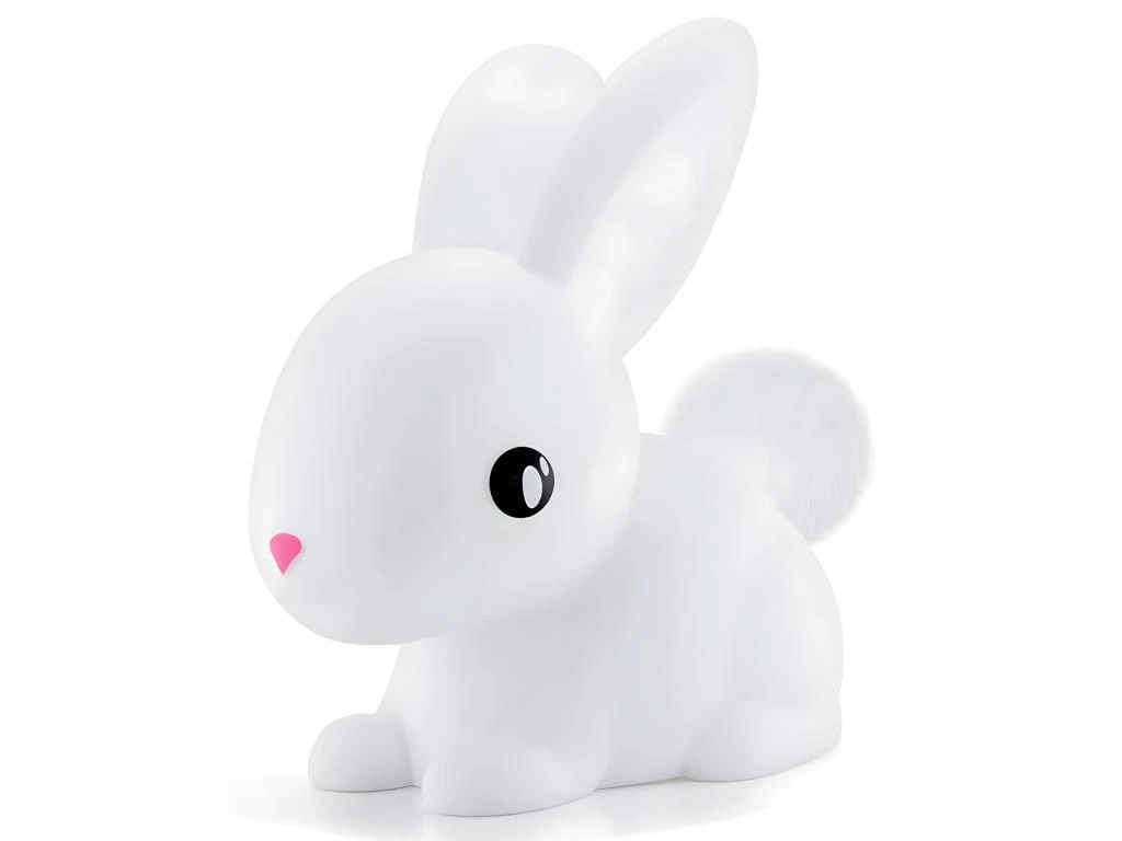 Veilleuse COTTON le Lapin LED Lumière multicolore par défilement – Lumière LED – Mode normal – Mode minuterie : s’éteint au bout de 15 minutes – Interrupteur ON/OFF sous la licorne – Fonctionne sur piles : 3 x AAA non fournie – En PVC Dimensions : Hauteur 14 cm – Largeur 15 cm – Profondeur 8.5 cm