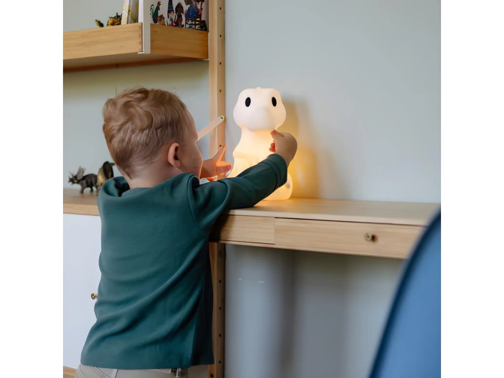 Une veilleuse en forme de tyrannosaure toute molle qui produit une lumière douce sur 6 niveaux d’intensité. Se recharge rapidement par micro-usb. Matière : ABS mou et vinyl Dimensions : 14 x 16 x 25 cm