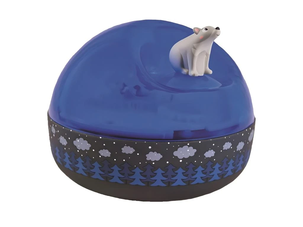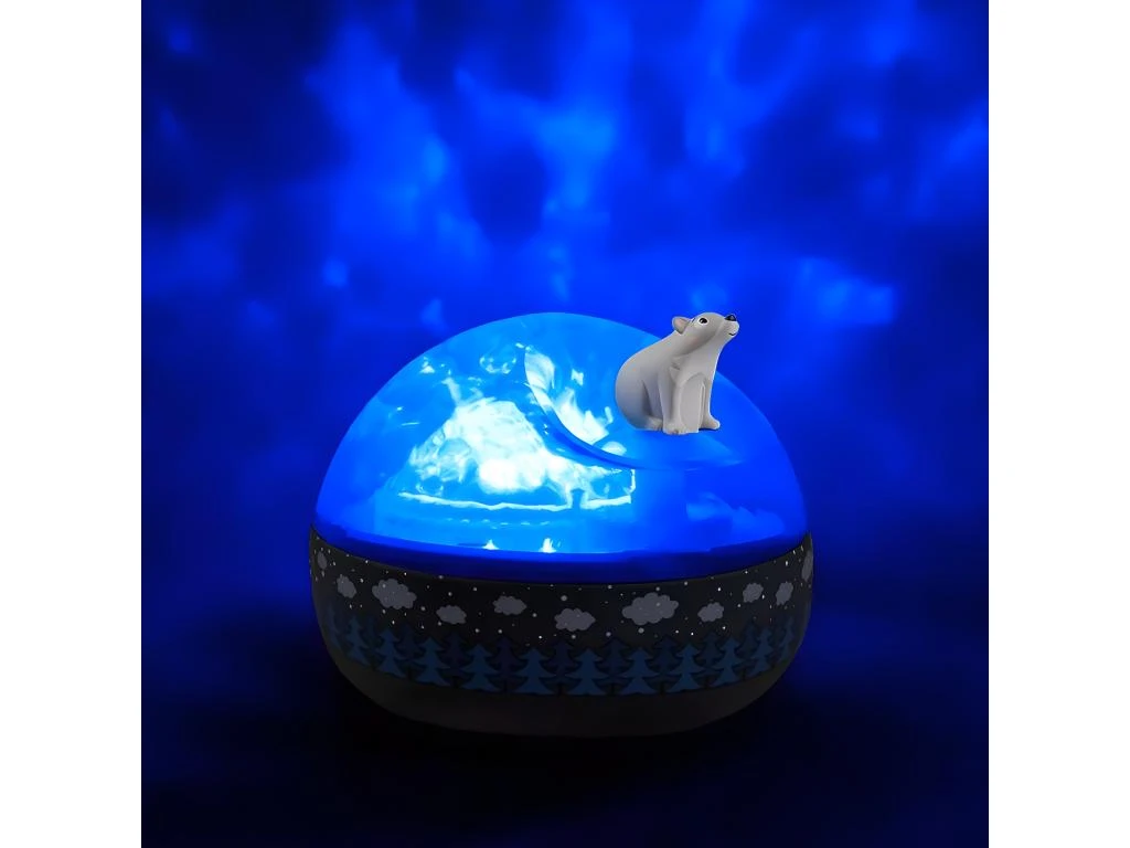 Veilleuse Projecteur d’aurores boréales – Ours sur la banquise Hauteur 10 cm – Diamètre 12 cm Douce mélodie 3 modes de lecture Arrêt automatique au bout de 30 minutes 3 piles LR06 (incluses).