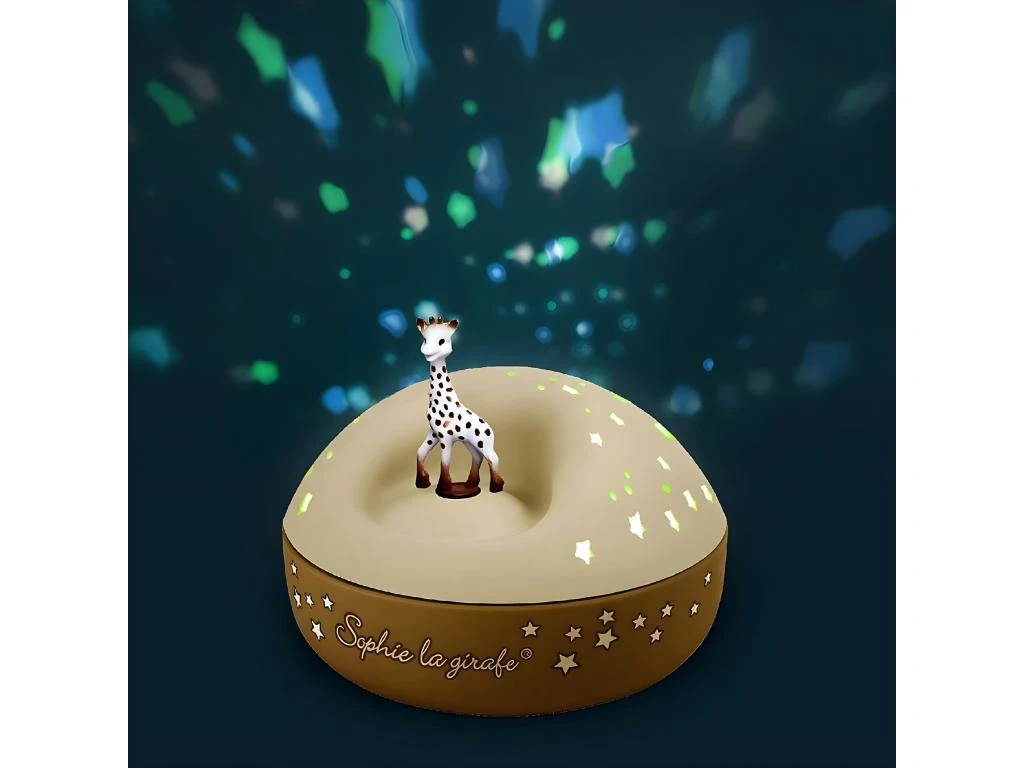 Veilleuse Projecteur d’Etoiles Musical Sophie La Girafe Dim : 12 cm Projection d’un ciel étoilé Douce mélodie 3 modes de lecture Arrêt automatique au bout de 30 minutes 3 piles LR06 (incluses).
