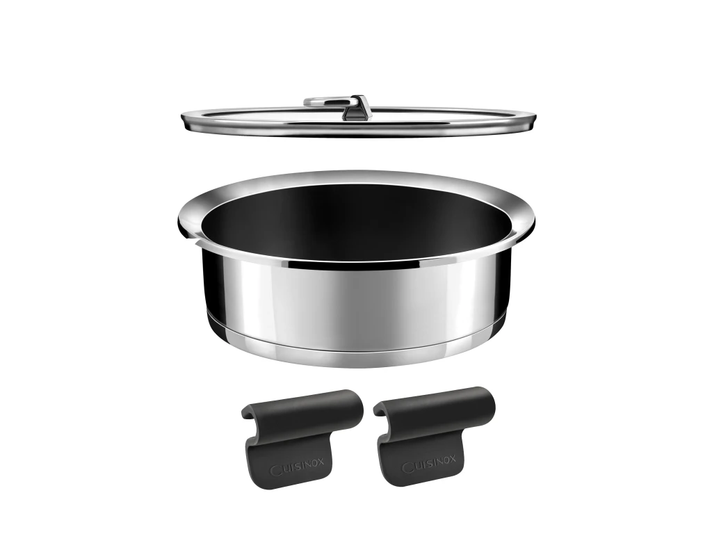 Lot 3 pièces composé d’une sauteuse revêtue en acier massif inox 18/10 de diamètre 24cm, de anses en silicone et d’un couvercle en verre de la collection Ycône par Cuisinox. Revêtement Greblon C3 haut de gamme par Weilburger offrant durabilité et sécurité alimentaire. Triple fond thermo-diffuseur haute performance : chauffe rapide et répartition optimale de la chaleur qui réduit le temps de cuisson et conserve les vitamines. Epais, le fond est anti-déformation et compatible tous feux dont induction. Bord verseur anti-projection sur toute la circonférence de la sauteuse